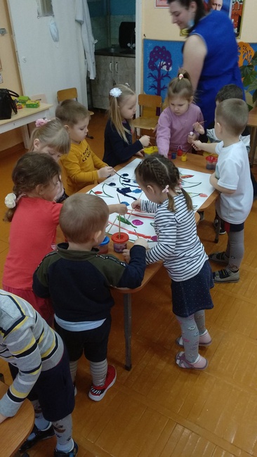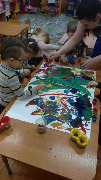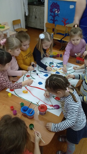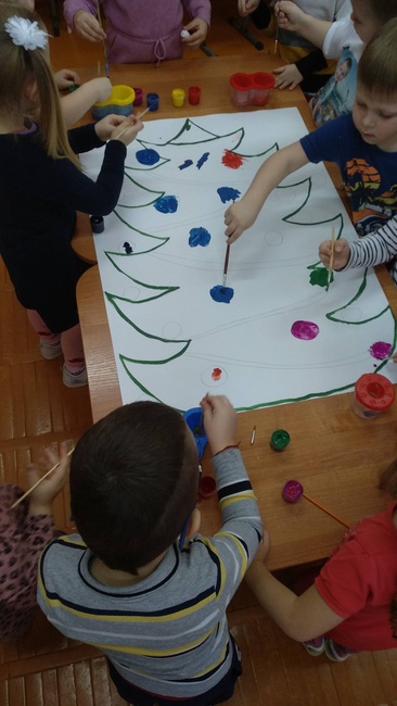 "Мы рисуем праздник" во второй младшей группе "Бабочка". Музыкальный руководитель предлагает детям выбрать краски, которые характеризуют новогодний праздник. Разворачивает ватман на котором уже нарисована ёлка в праздничном убранстве. Украшения обозначены контуром. Дети вместе с музыкальным руководителем докрашивают рисунок