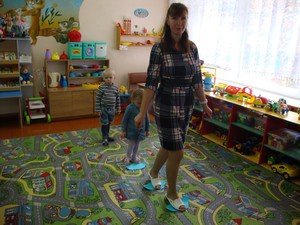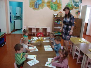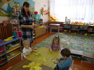Цели: продолжать знакомить детей с цветами (красный, желтый, зеленый), понятиями «большой - маленький», «один-много», «верх-низ»; учить детей повторять слова и действия по образцу взрослого; формировать навыки работы с пластилином; развивать мелкую и общую моторику; развивать зрительное и слуховое восприятие, чувство ритма. Оборудование: осенние листья большие и маленькие; вырезанные из картона листья желтого, красного и зеленого цветов и таких же цветов корзины, капельки голубого цвета; вырезанные из картона лужи; пластилин желтого, красного и зеленого цветов, листы бумаги с нарисованным деревом; металлофоны.